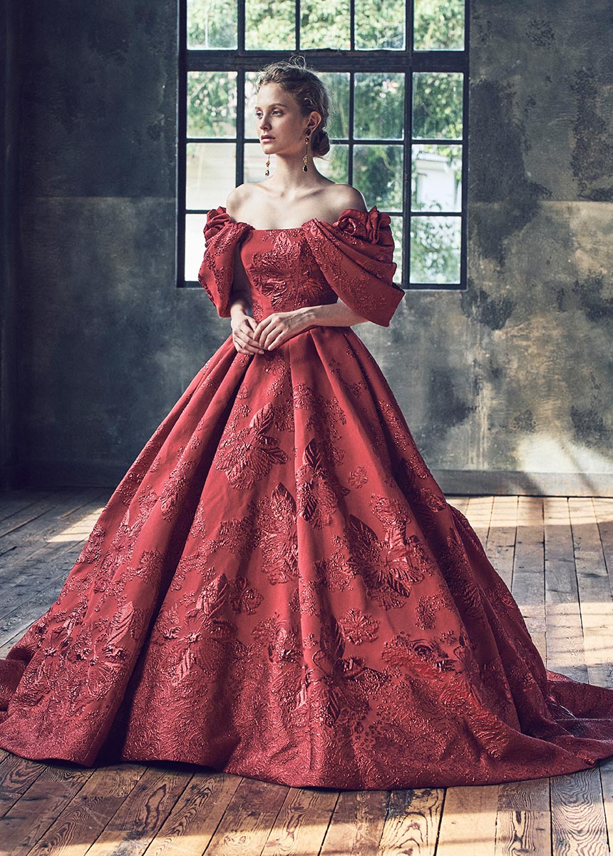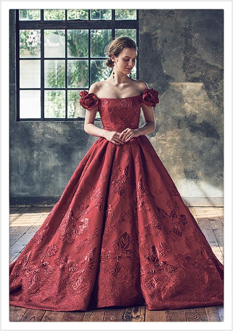 ジャガード生地の柄行きを活かし、たっぷりの分量感と柄の凹凸感がインパクトのある シンプルなカラードレス。大きなドレープスリーブは取り外し可能です。