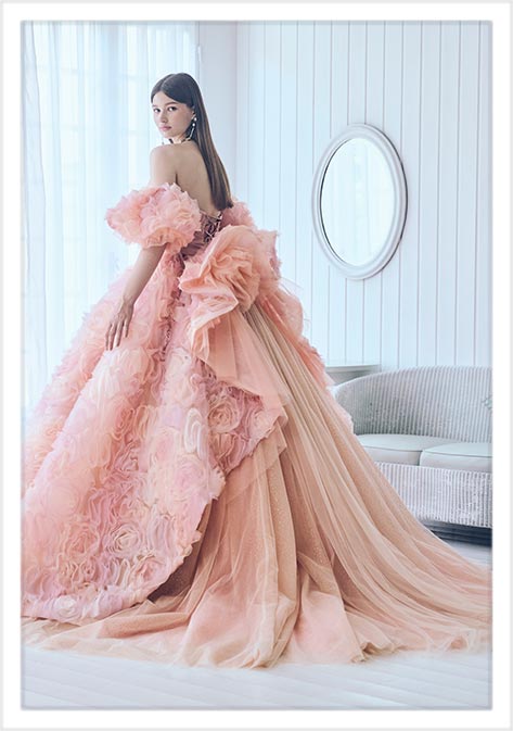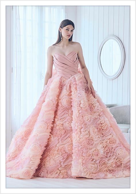 オレンジからピンクへのグラデーションリボンのスピン加工(花のようにリボンを丸めながら止めつけていく技法)の素材をボリューム感たっぷりにバッスル風にアレンジしたフォトジェニックなカラードレス。加工素材の下にはグリッターチュールを重ね、きらめきも感じられる華やかなデザインです。
