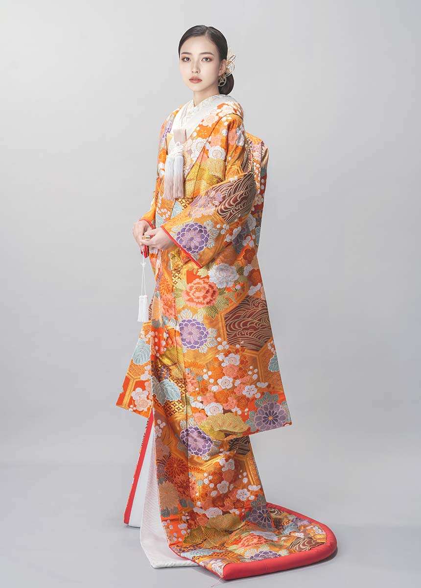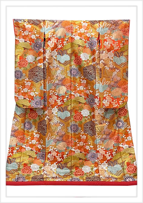 京都西陣における技術の最高峰である唐織の打掛。亀甲柄に桐の花・松竹梅など縁起の良い吉祥柄を緻密に織り上げた華やかな逸品。