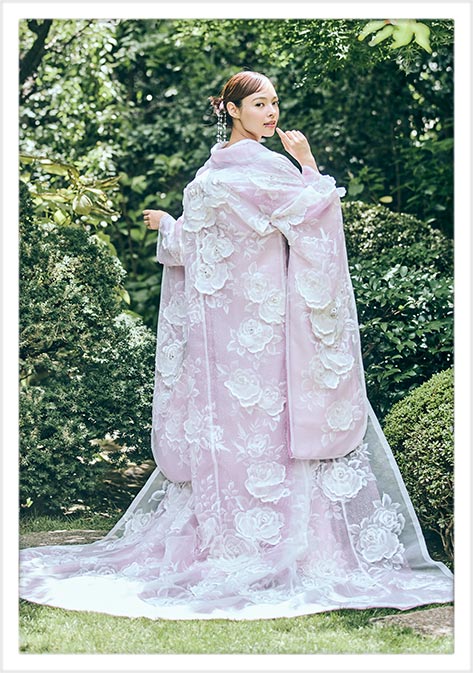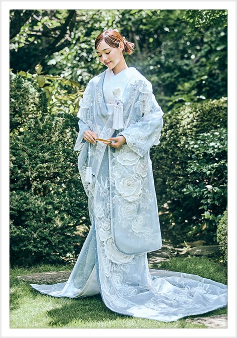 YUMI KATSURA 独自のオーガントレーン打掛。 取り外し式の異なる色のアンダーキモノを重ね、2WAYで楽しんでいただけるニューキモノスタイル。 白.ピンク.ブルーのカラーバリエーションからお選びいただけます。
