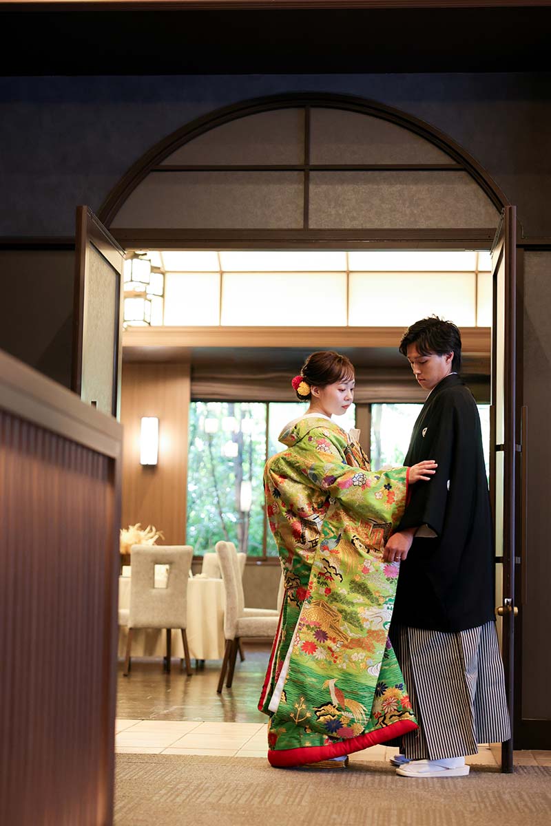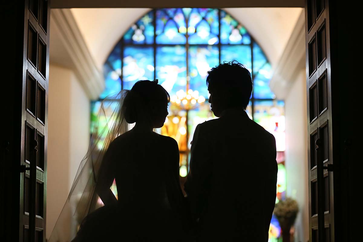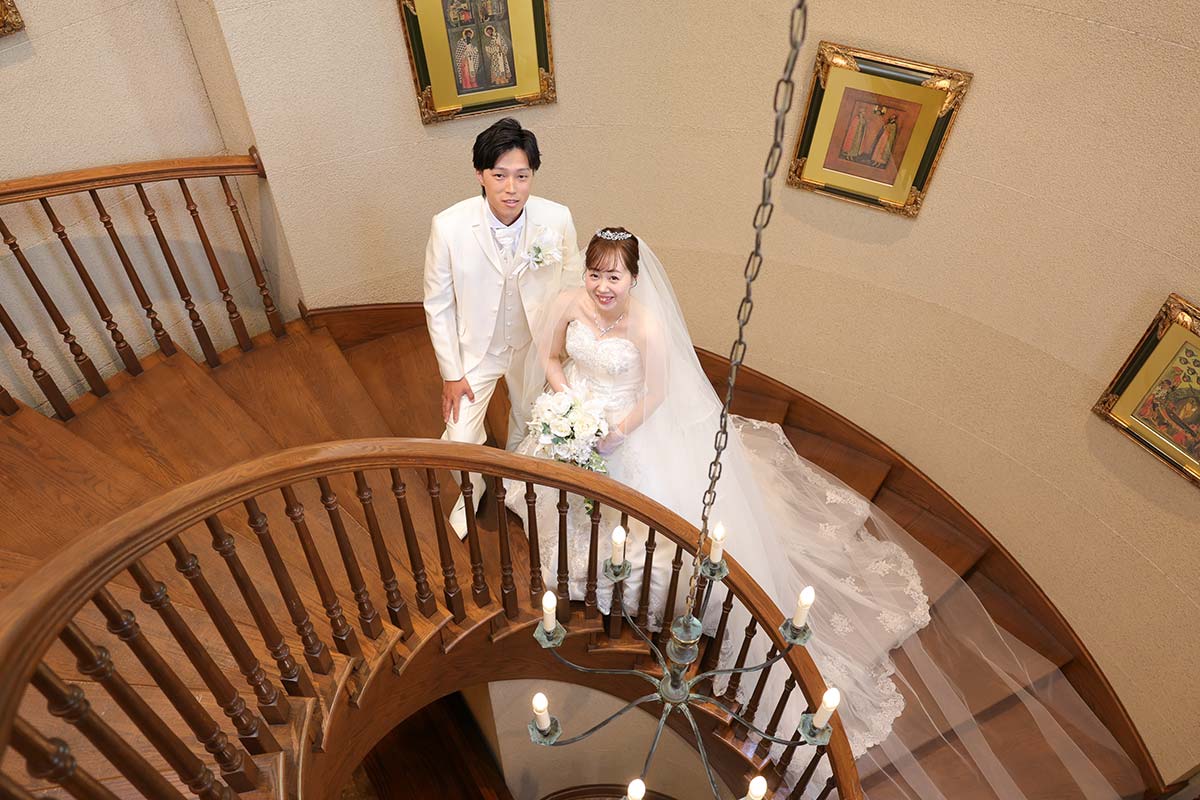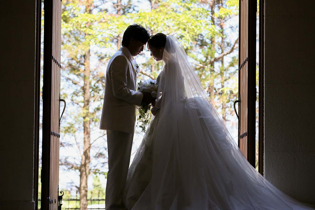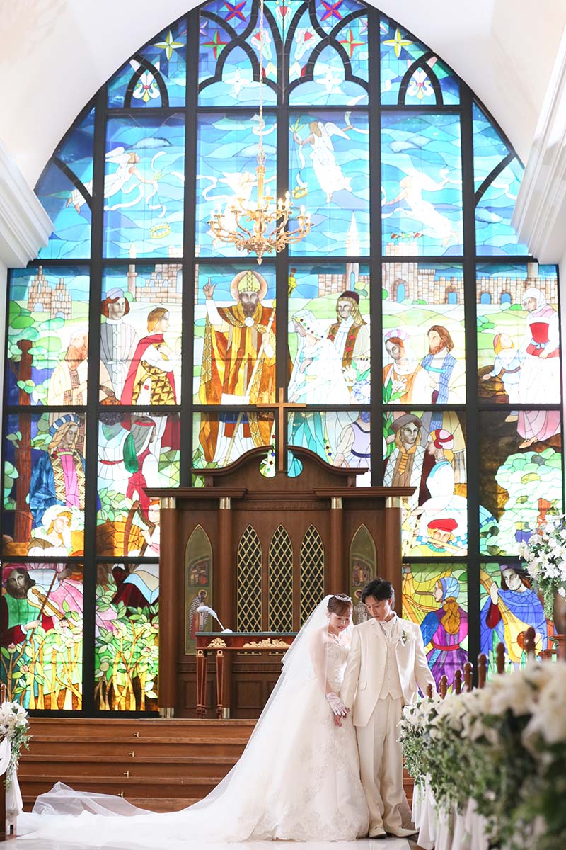 チャペルの広さを活かしたウエディングドレスのカット。